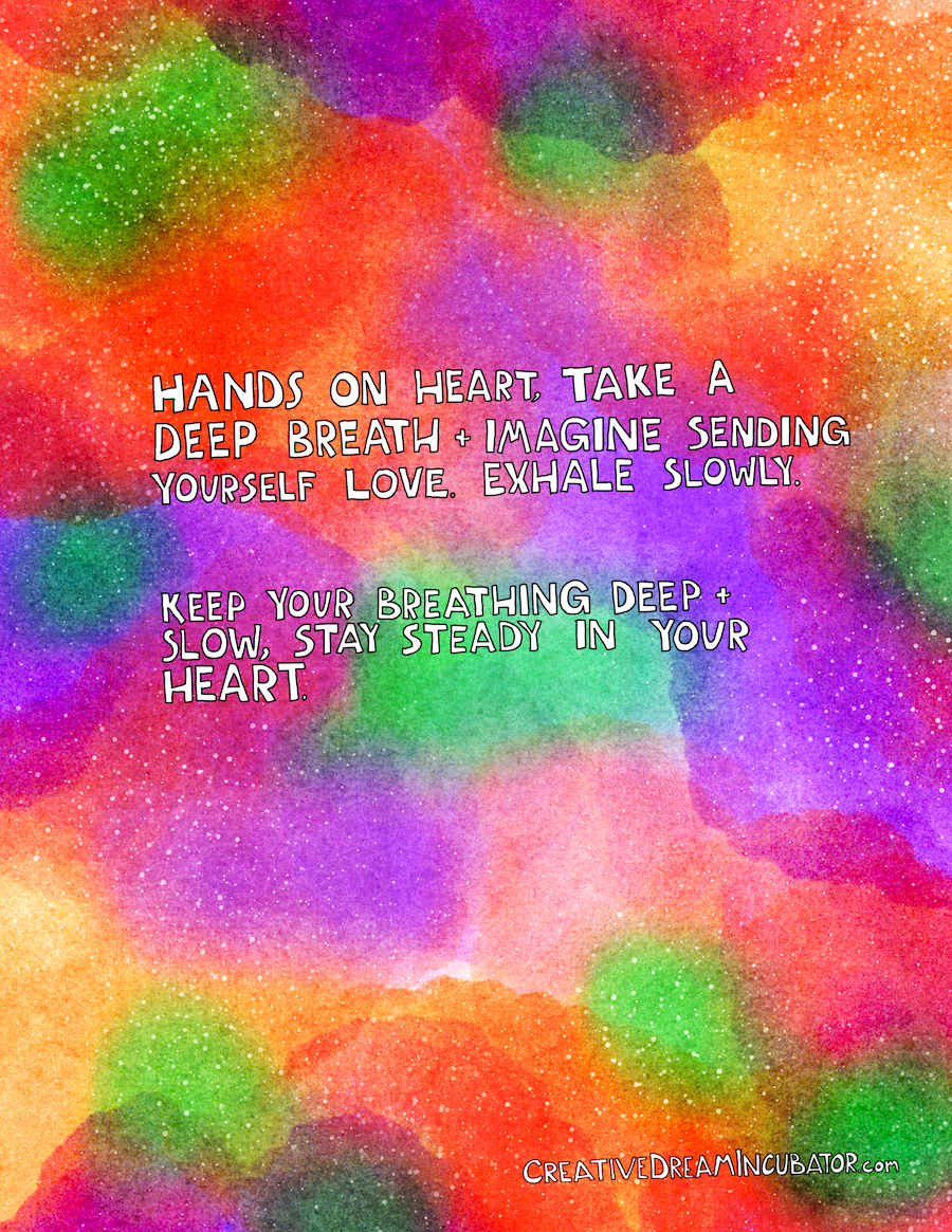 Hands on heart, take a deep breath and imagine sending yourself love. Exhale slowly.